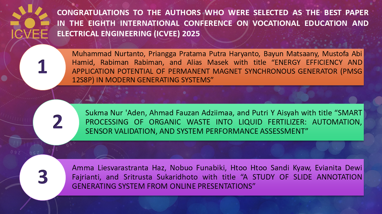 2024 The Seventh International Conference on Vocational Education and Electrical Engineering (ICVEE) is an international conference organized by the Faculty of Engineering – Universitas Negeri Surabaya (FT-UNESA). The conference will be held in Malang, Indonesia, inviting academics, researchers, and practitioners to submit case studies of practice, theoretical papers, empirical studies, and other papers that address any topic within the broad areas of Vocational Education, Electrical Engineering and Informatics. On this occasion, the conference’s theme is “Integrating Scalable Digital Connectivity, Intelligence Systems, and Green Technology for Education and Sustainable Community Development”. IEEE Indonesia Section will support ICVEE. Accepted papers will be submitted for inclusion into IEEE Xplore subject to meeting IEEE Xplore’s scope and quality requirements.